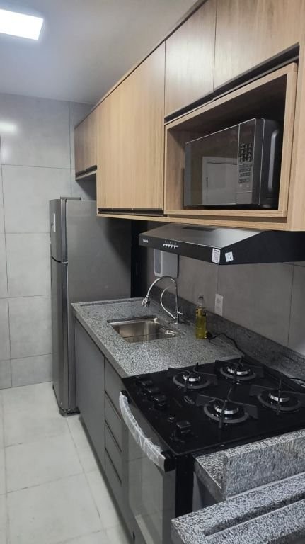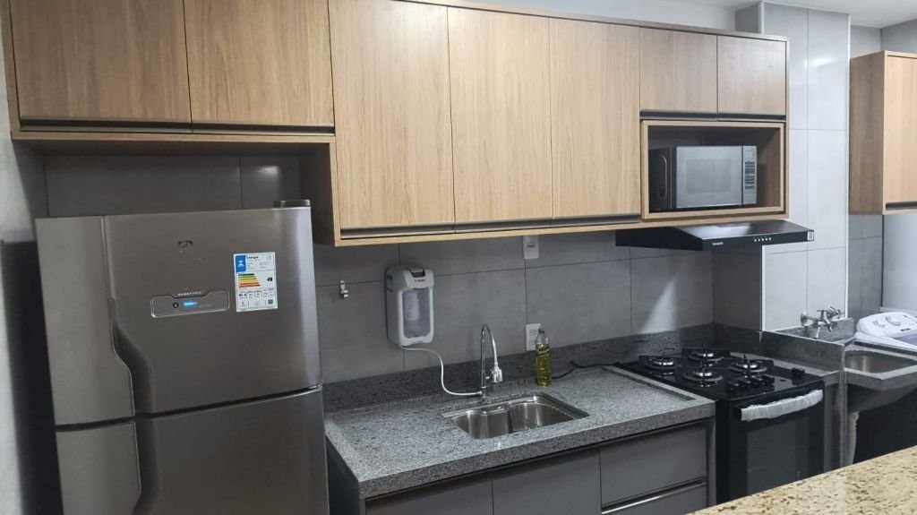 Apartamento sol da manhã, 3º andar, com 2 dormitórios, varanda, garagem coberta, armários embutidos, todo mobiliado (geladeira Frost Free, fogão embutido, microondas, máquina lavar, tv smart, sofá, mesa com 4 cadeiras, camas (casal e solteiro com escrivaninha), ar condicionado (1 dormitório), ventiladores. Condomínio completo.